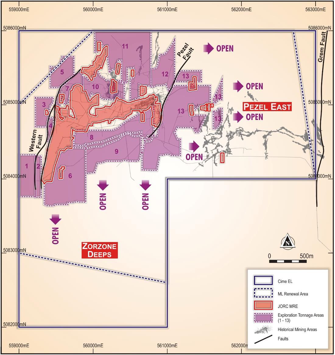 In addition to the current Exploration Target, the ground immediately to the east termed "Pezel East", between the Pezel Fault and Grem Fault is highly prospective. There is geological reconnaissance data which indicates it hosts significant strike extents of mineralised Metallifero Formation however, there is currently insufficient drilling or definitive historical evidence for this area to be included in the Exploration Target, and it will be assessed further once more evidence is collected.