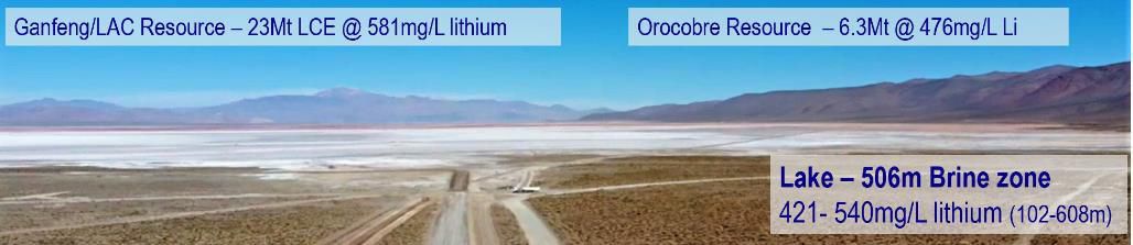 Lake has previously drilled and confirmed multiple high-grade lithium brines zones at it's Cauchari Project over a 506m interval (102m to 608m depth) (refer ASX announcement 23 August 2019). This drilling confirmed similar grades and lithium brines extending into Lake's properties from the adjoining Ganfeng/Lithium Americas JV production development at Cauchari. The higher-grade results averaged 493 mg/L lithium over 343m (from 117m to 460m), up to 540 mg/L. Lake anticipates similar potential from Olaroz and Paso.