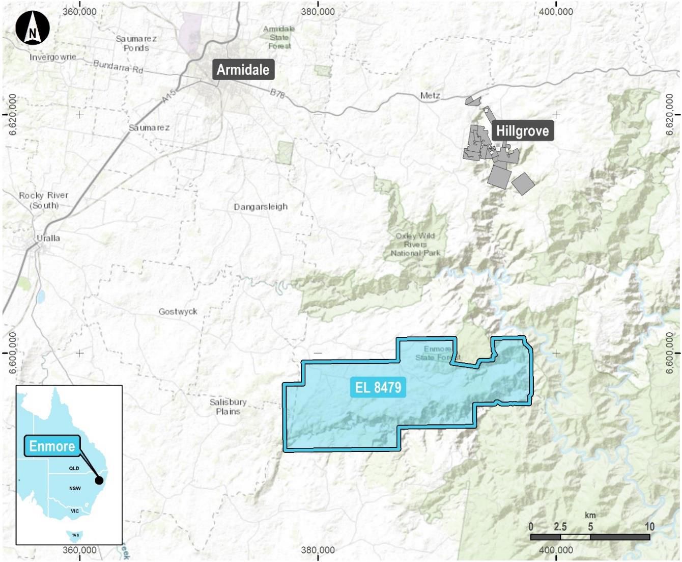 The Enmore Gold Project is located in the New England Fold Belt, approximately 30km south of the regional centre of Armidale in northern New South Wales. The operating Hillgrove Gold Mine (