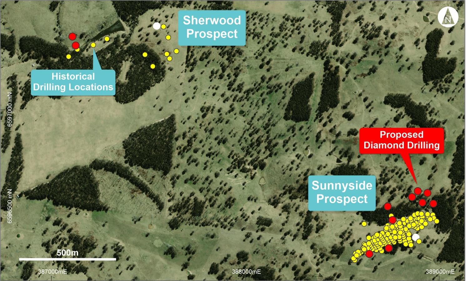 The proposed drill program includes a total of 11 diamond drillholes (1,800m) to test the Sherwood (2 holes) and Sunnyside (9 holes) Prospects. The proposed diamond drilling locations are shown in Figure 2* and Figure 3*. Down hole surveys and core orientation measurements will be taken and all core will be geologically logged, photographed and marked up for sampling. Sampling intervals will be based on lithology, alteration and mineralisation style with maximum intervals of one metre.