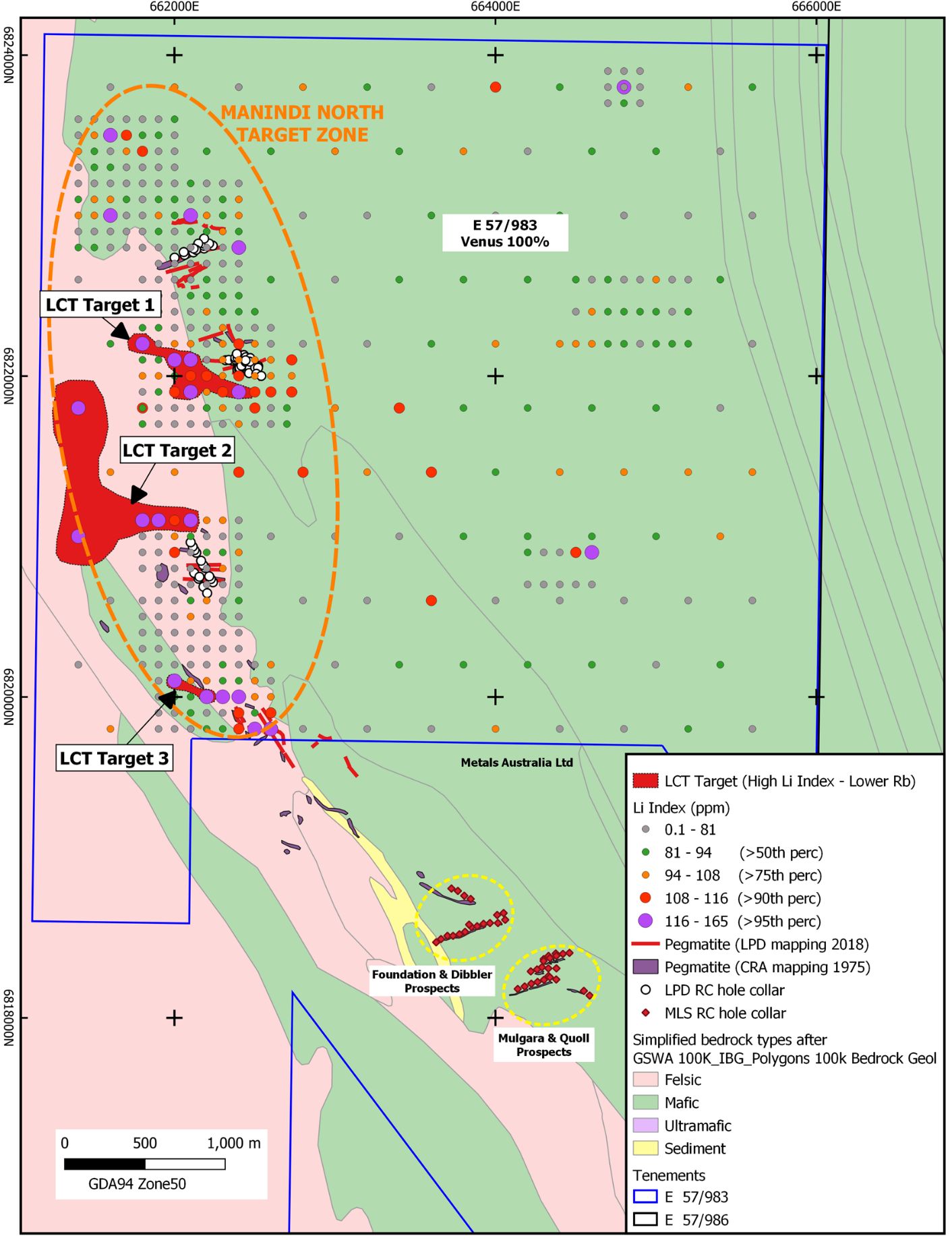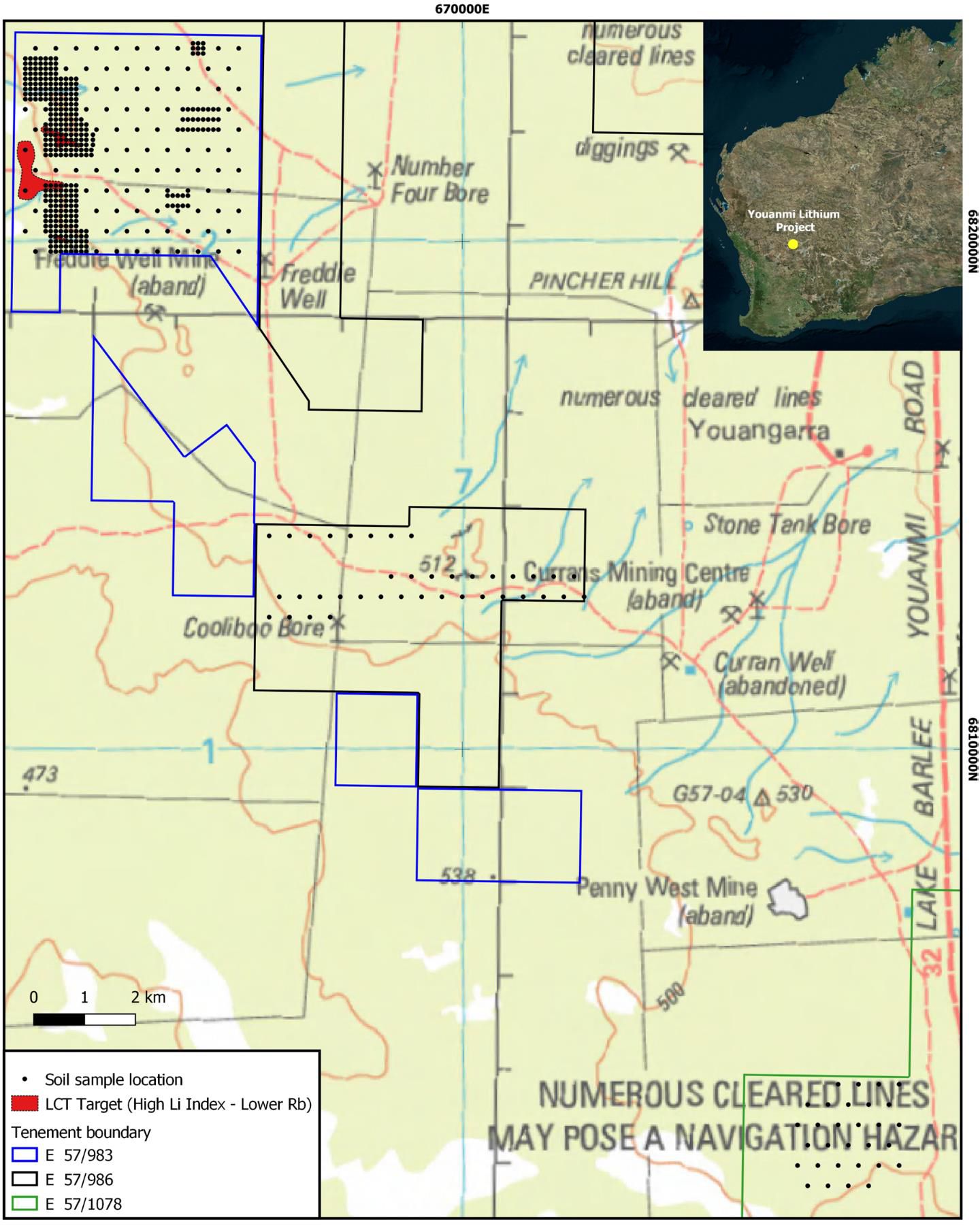- Soil geochemical survey delineates a c. 4 km long northnorthwest trending zone with lithium (Li Index) anomalies on E 57/983, some coinciding with pegmatite outcrops.