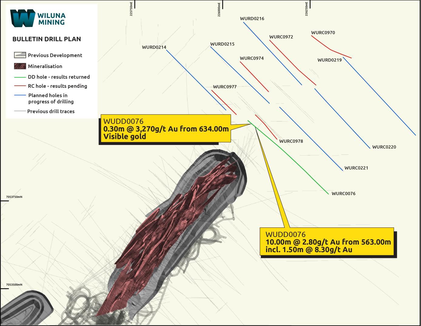 WUDD0076: 0.30m @ 3,270g/t