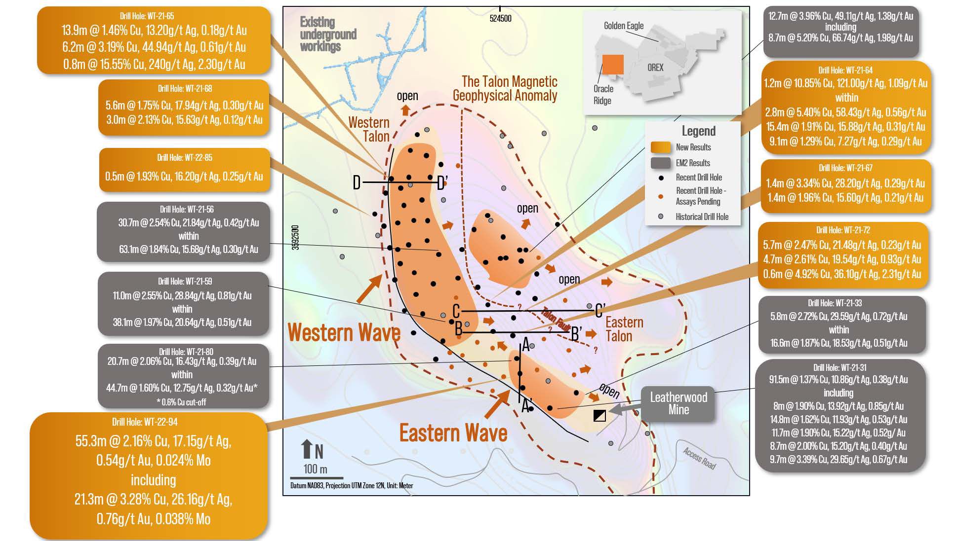 - Drilling in the southern Talon (WT-22-94) intersected extensions to strong mineralisation in previously reported holes (WT-21-31, WT-22-80). The zone is at least 150 metres long in a north south direction and is interpreted to dip very steeply to the east (Figure 1, Figure 3*). Preliminary interpretation suggests that this rich zone is controlled by local stratigraphy and proximity to the Leatherwood-Sediments contact. New drilling supports the interpretation that a second Wavelike structure is present in this area. Elevated molybdenum grades of 0.038% Mo were also received in drill hole WT-22-94. Molybdenum had not been routinely assayed by previous owners and its spatial continuity is not well understood. Skarn expert Dr Larry Meinert has been engaged to assist with evaluating the latest results including the elevated molybdenum and how this can assist in vectoring toward areas of further mineralisation. Molybdenum is common in other copper skarns and can be a valuable co-product from mines. WT-22-94 also included a 55.3 metre interval at an average of 0.54g/t gold which is more than two times the MRE gold grade at a 1% copper cut-off grade.