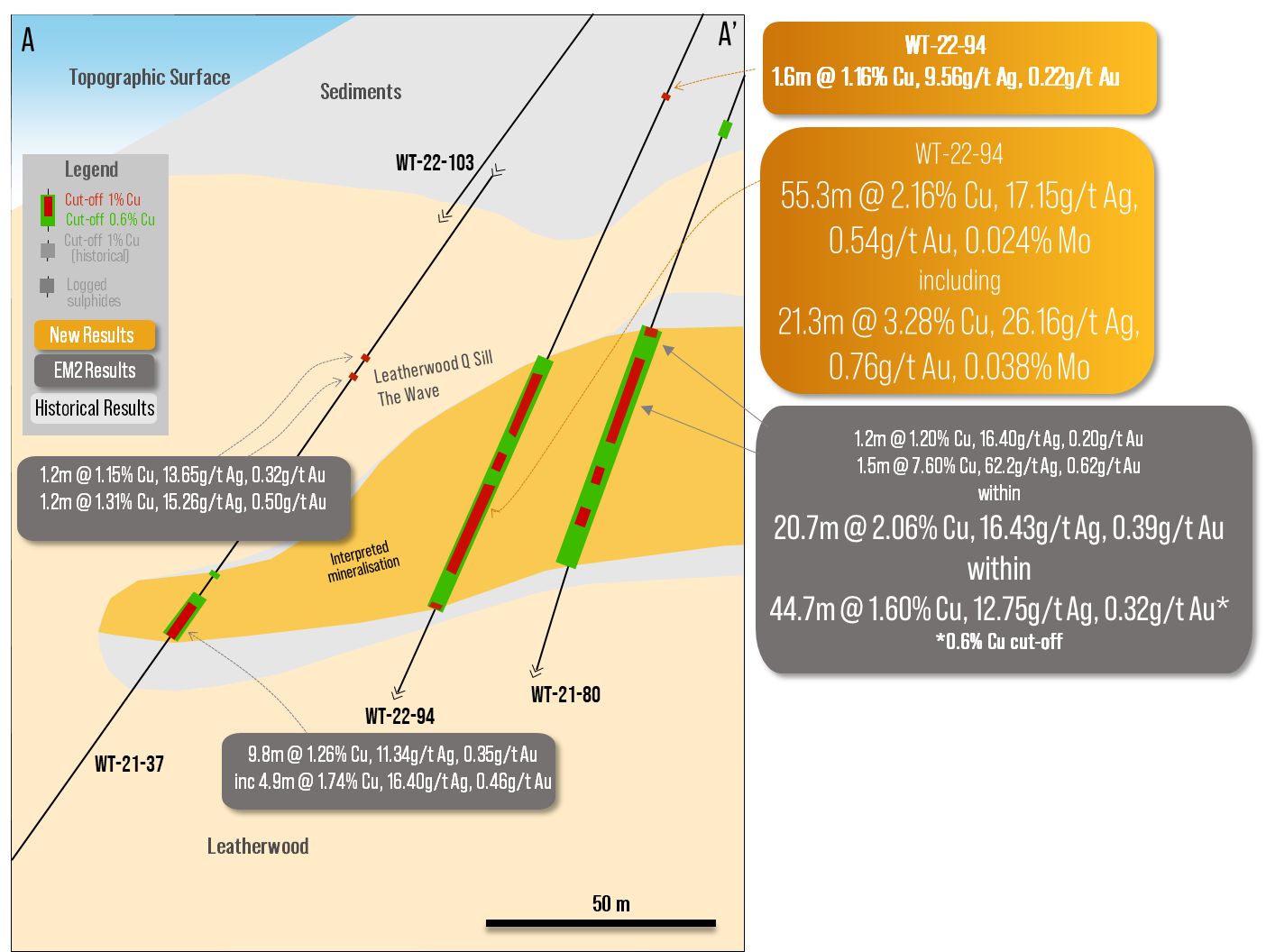 - WT-21-93 was drilled in the central mine area and confirmed known mineralisation while localised assays returned over 10% copper. The lower part of the hole confirmed significant mineralisation is present to the west and east of the Leatherwood Q-Sill (Figure 2, Figure 9*).