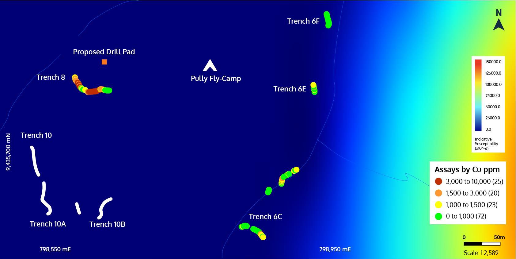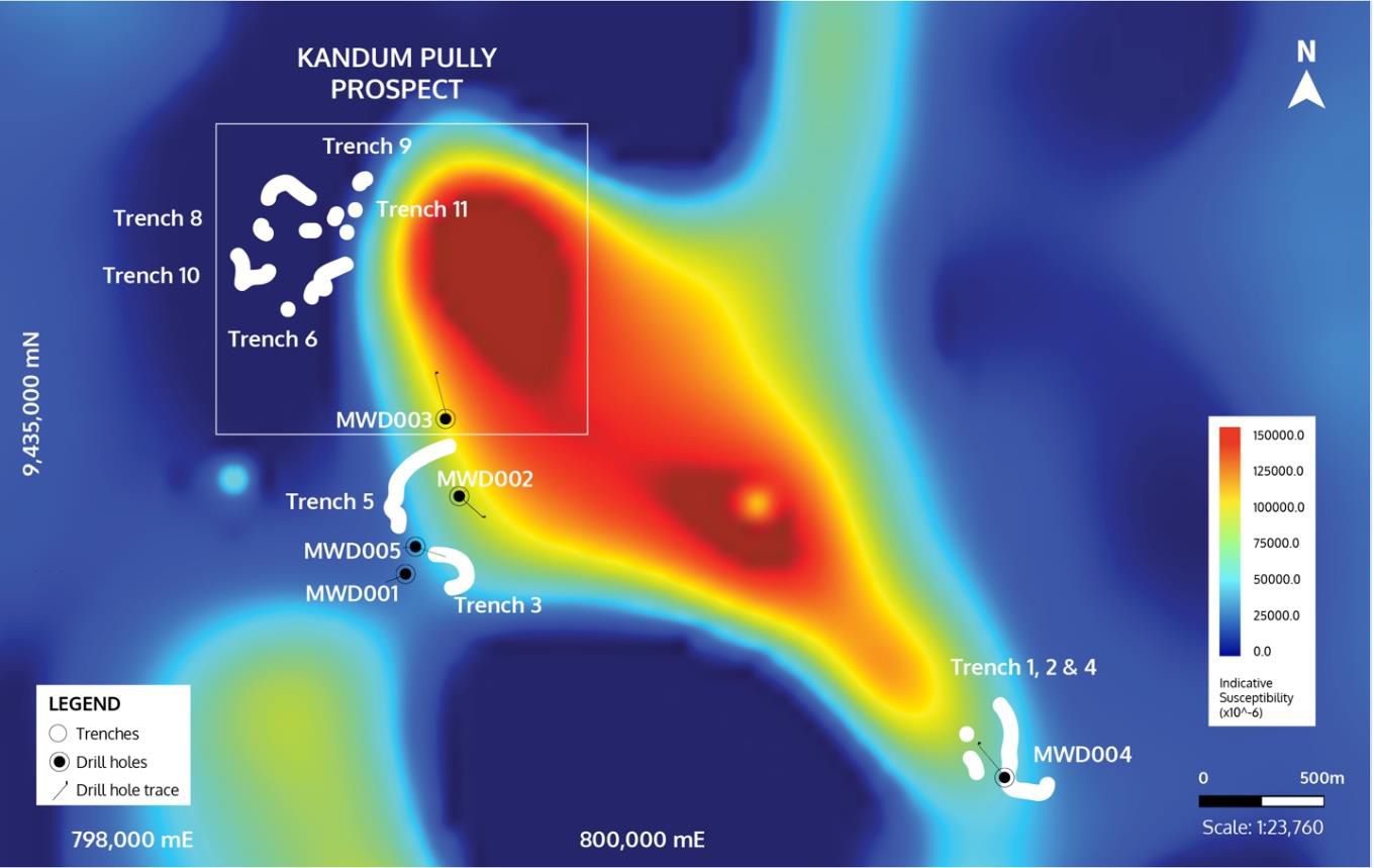 - The copper mineralisation is associated with widespread clay alteration and is located with the magnetic low feature at Kandum - Pully, that has been previously identified as a potential buried porphyry target.