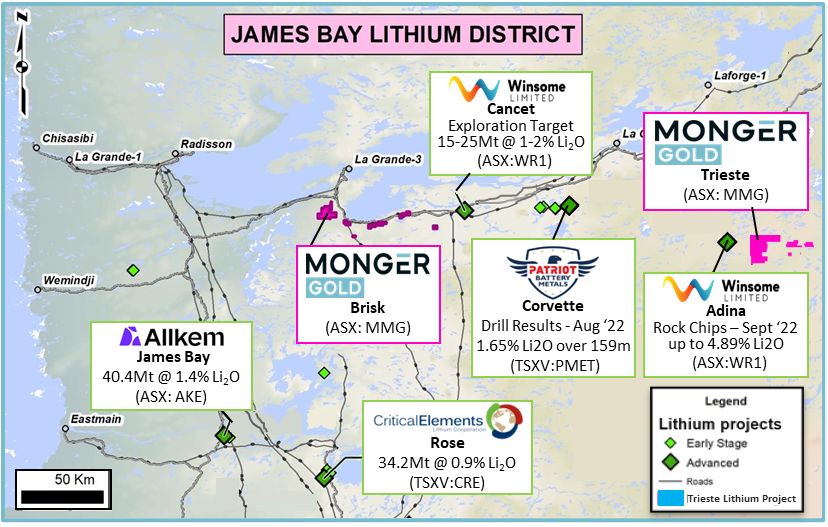 "The acquisition of these claims along the inferred continuation of the Trieste Greenstone Belt demonstrates Monger's continued commitment to explore highly prospective areas for LCT Pegmatites. Despite recent lithium discoveries within the James Bay Lithium District, it remains significantly underexplored relative to other historic lithium pegmatite districts. We look forward to assisting Monger in the exploration of the newly acquired Trieste Lithium Project."