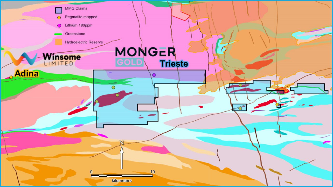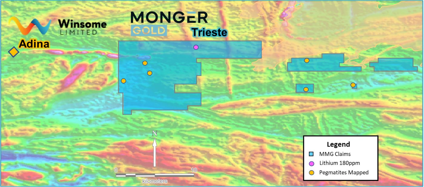 "The successful acquisition of the Trieste Lithium Project represents a significant milestone for Monger. Multiple mapped pegmatites, an existing anomalous lithium result, favourable indicator minerology all within close proximity to Winsome's Adina Lithium Project, provides us with confidence in potentially discovering spodumene bearing pegmatites."
