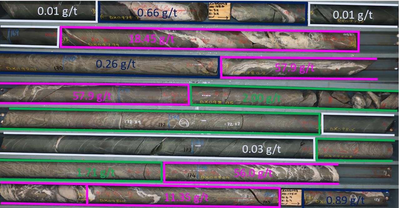 - 6.76m @ 15.40 g/t Au from 169.13m in RXDD048