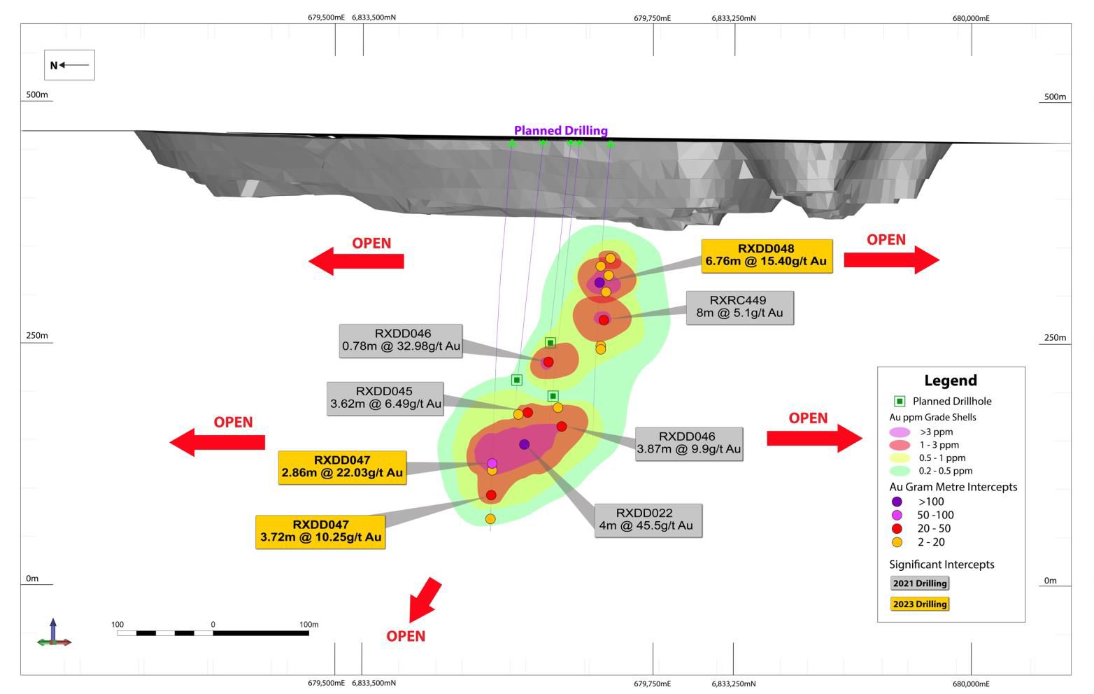 - 2.86m @ 22.03 g/t Au from 356.39m in RXDD047 and;