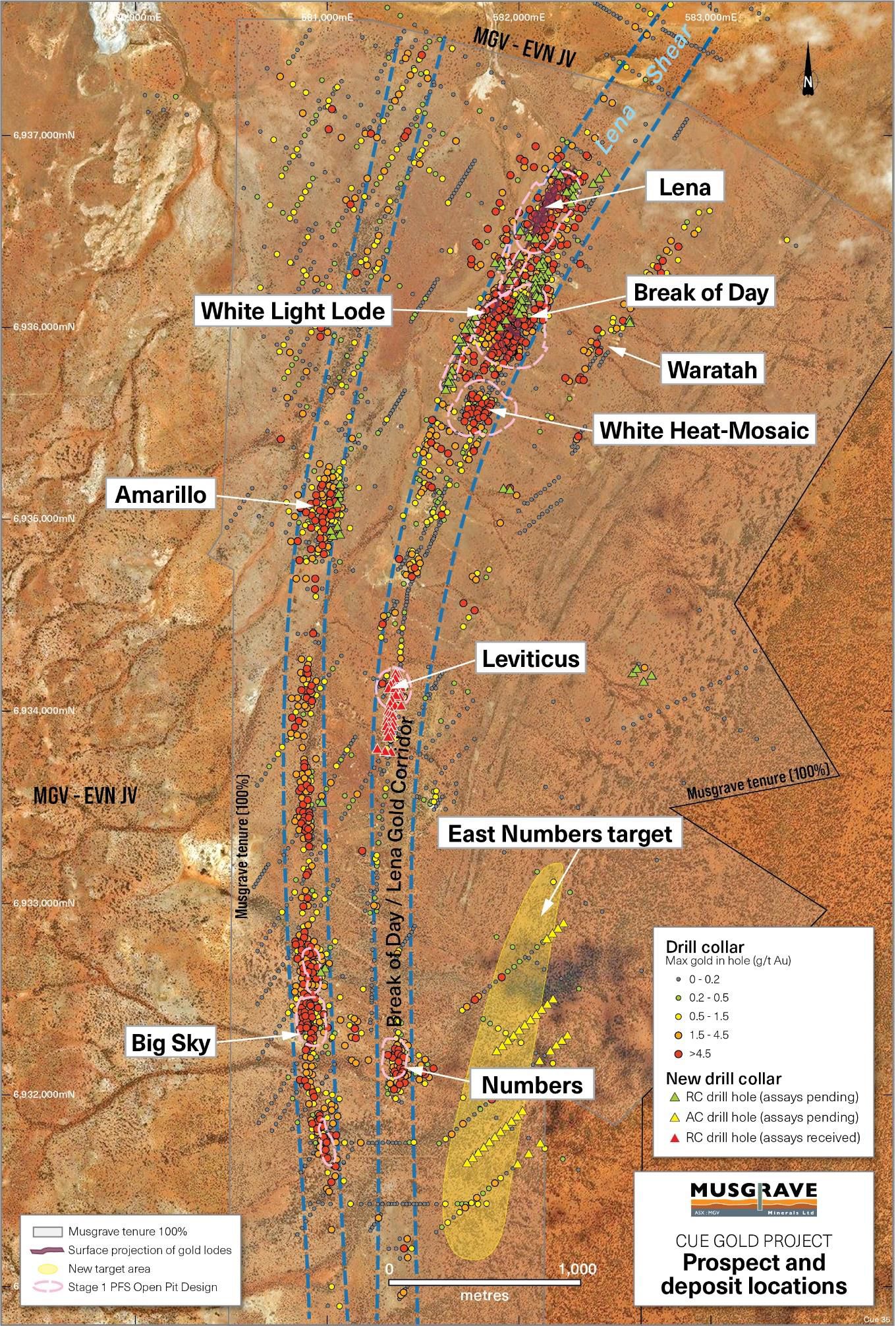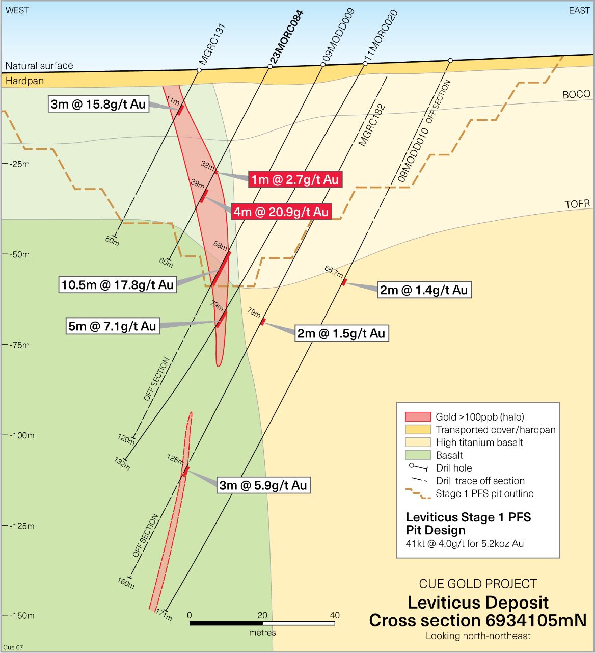 Musgrave Managing Director Rob Waugh said: "The strong gold results continue at Cue with this drilling at the Leviticus deposit aimed at extending the mineralisation and converting the Inferred resource to the higher confidence Indicated category. The Leviticus deposit is only 1.5km south of White Heat and is being considered as an early mining option to enable the pit to be utilised for either water storage or in-pit tailings in the subsequent years of development, thus reducing capital costs."