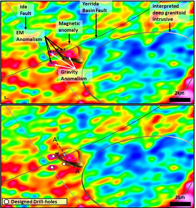 - The Oval Target was originally defined by a Rio Tinto EM Survey in the late-1990s; that has coincident EM conductivity and gravity highs, located on the intersection of a crustal scale and basin defining fault, and within favourable stratigraphy of the Yerrida Basin for coppergold mineralisation formation