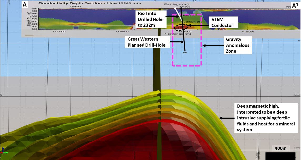 - Modern modelling of a VTEM survey completed in 2012 found drilling completed at the Oval copper-gold target by Rio Tinto failed to intersect the EM conductor, with the Rio Tinto hole terminated 70m above the conductor