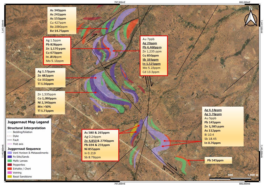 - The Juggernaut VHMS copper-gold targets were defined by comprehensive field work programmes, that included geological mapping, surface sampling, modelling and interpretation.
