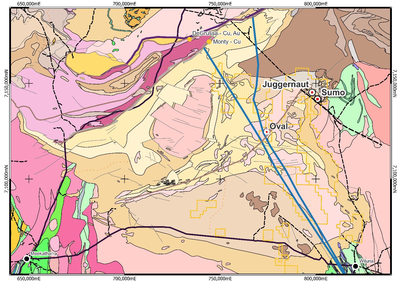 - The interpreted Juggernaut Volcanic Hosted Massive Sulphide (VHMS) copper-gold mineralised system is located 70kms south-east of the DeGrussa and Monty Copper-Gold Deposits.