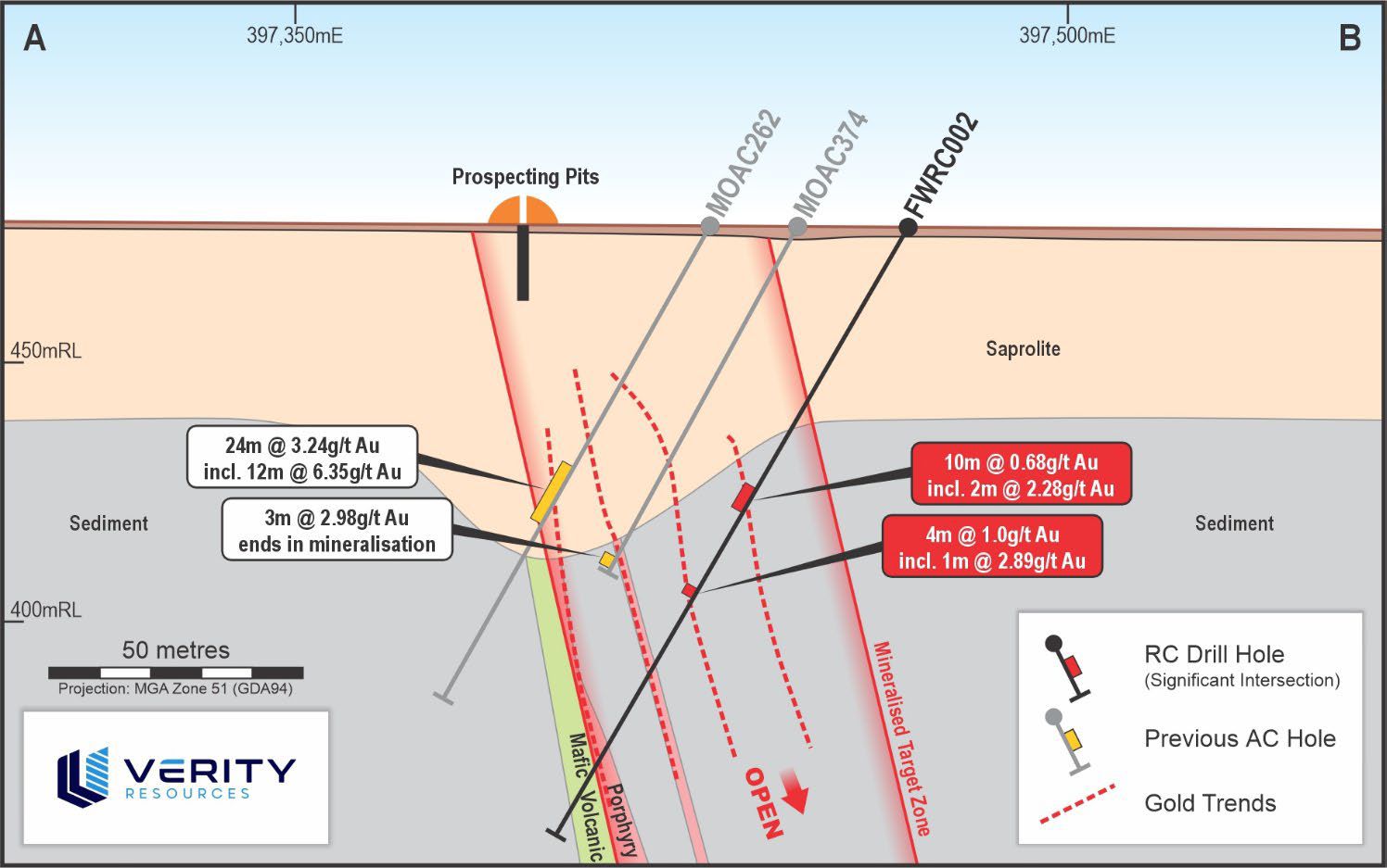 o 3m @ 2.98g/t Au (MOAC374 from 72m) ending in mineralisation