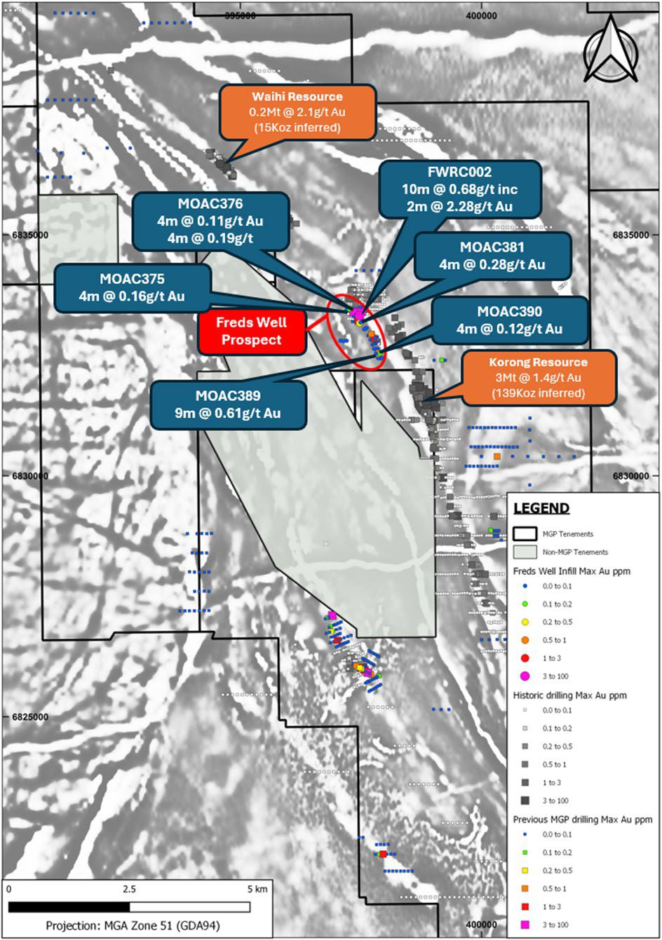 The encouraging results near surface from the Fred's Well drill programs have confirmed the prospect as a mineralised gold zone over a strike length of ~1.1km. Situated along strike and approximately 2km northwest from the 139koz Korong deposit, this zone has the potential to contribute to future resource ounces, pending further drilling and exploration work.