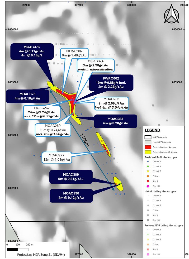 The results confirm an extension to the mineralised gold strike to a total length of 1.1km, further confirming Fred's Well as a potentially new mineralised gold zone.