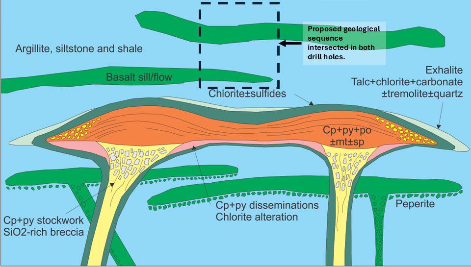 - VHMS pathfinder co-enrichment (Cu-Au-Bi-S-Zn-As-Pb-Ag-Te-Sb-In) on discrete sedimentary horizons in both drill-holes indicates multiple possible fallout zones from adjacent VHMS "black smokers";