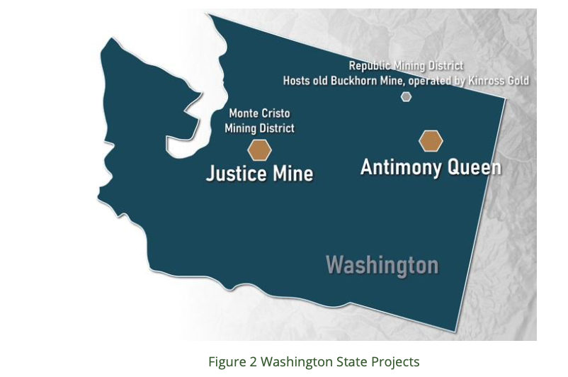 >The Antimony Queen and Justice Mine projects in Washington are situated within historically productive mining districts, with prior output of antimony, gold, and silver.