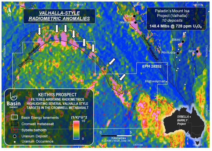 Filtering airborne radiometric data to highlight the alteration sequence of other known uranium deposits in the area identifies several significant radiometric anomalies that are present crossing the Sybella granite and through the Cromwell metabasalt. Analogies can be drawn with similar structural and geological settings with Paladin Energy's Mount Isa (Valhalla) project, which contains 148.4 Mlbs of U3O8 at 728 ppm, and a combined 116 Mlbs within the Valhalla, Odin and Skal resources located around 7 km to the east of Basin's license EPM 28252; refer figure 9*.