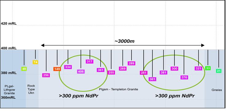 o Drill target three - Hard-rock granite-hosted REE system (Q2 2026 program), analogous to Red Metal's Sybella Discovery. Recent auger drill sampling returned numerous significant results including1 5 m @ 1,951 ppm TREO with 578 ppm Nd+Pr oxide, incl. 3 m @ 705 ppm Nd+Pr oxide.