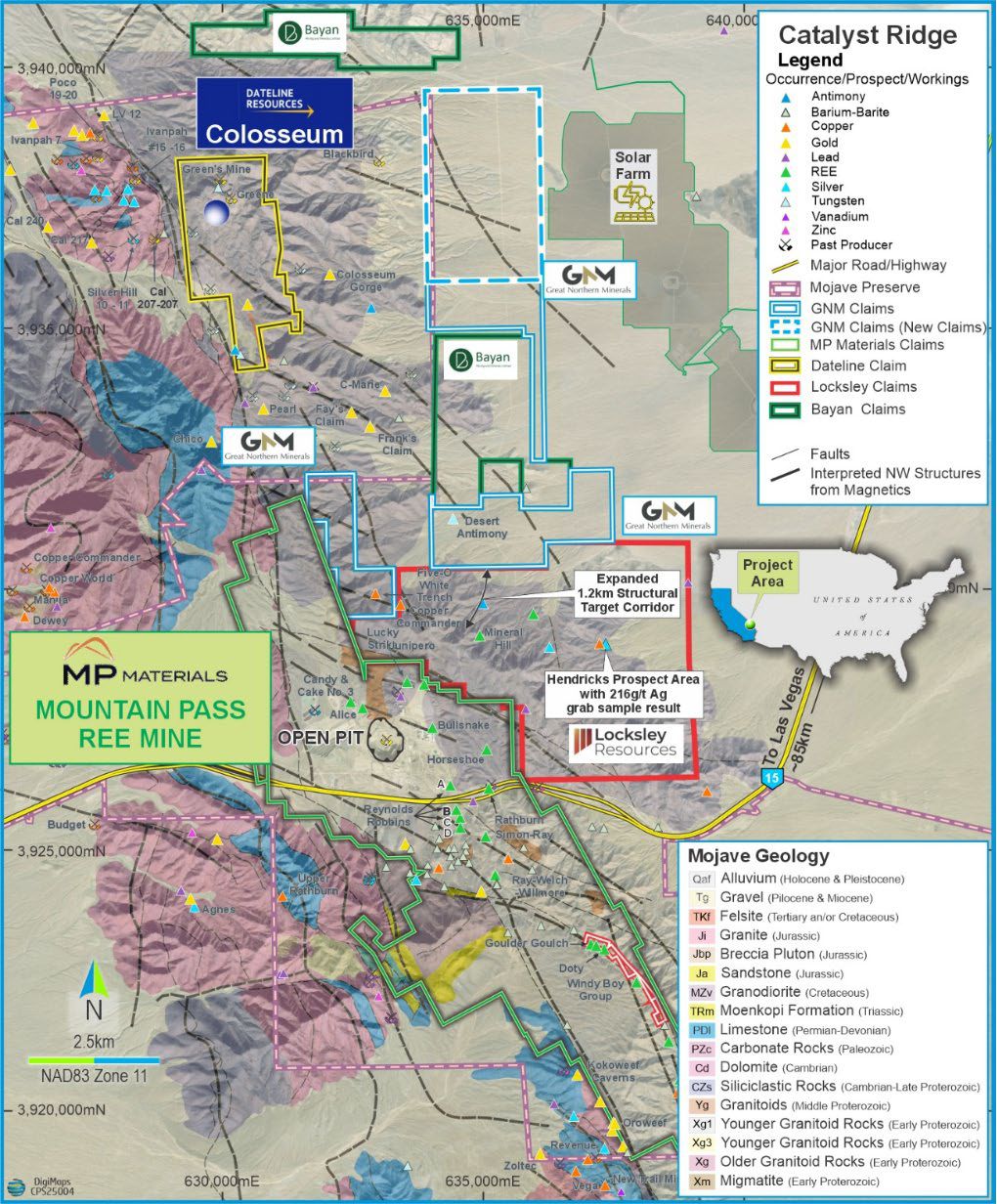 The Catalyst Ridge Project is located in the world-renowned Mountain Pass District, a globally significant REE mining area in California's Mojave Desert. The Project is made up of four separate claim areas comprising of a total of 214 lode mining claims totalling approximately 18km and is a highly prospective REE and antimony opportunity within the world class Mountain Pass District. The Project is strategically located in a key United States critical minerals hub, supported by strong government initiatives to strengthen domestic supply chains.