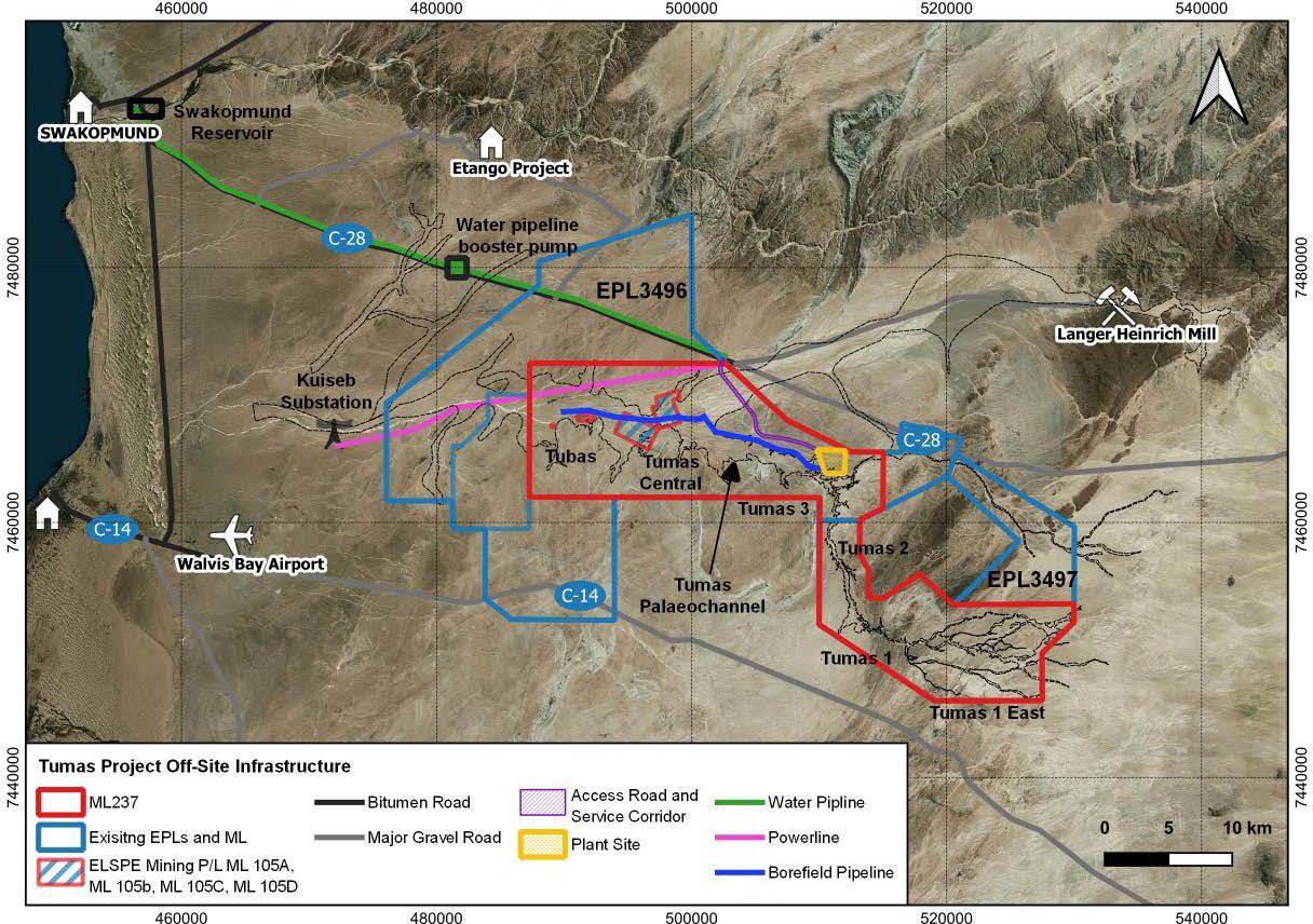 Fresh water for the Tumas Project will be supplied from the Swakopmund Reservoir managed by the Namibia Water Corporation Ltd (NamWater), via a 2.5 GL per year 65 km water pipeline running parallel to the C28 highway.