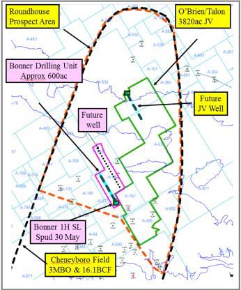 Talon holds a 24.25% WI in the Bonner 1H and the surrounding 600 acres which is being operated by O'Brien Energy (O'Benco), a private oil and gas operator located in Shreveport, Louisiana who retains a 75% WI. If the Bonner 1H is successful there is adequate acreage within the 600 acres to accommodate additional drilling. Talon now holds approximately 7264 net acres in the Roundhouse prospect area.
