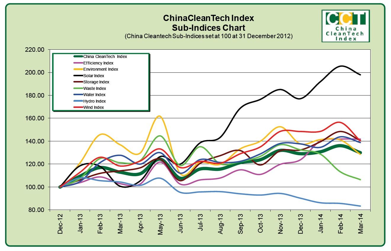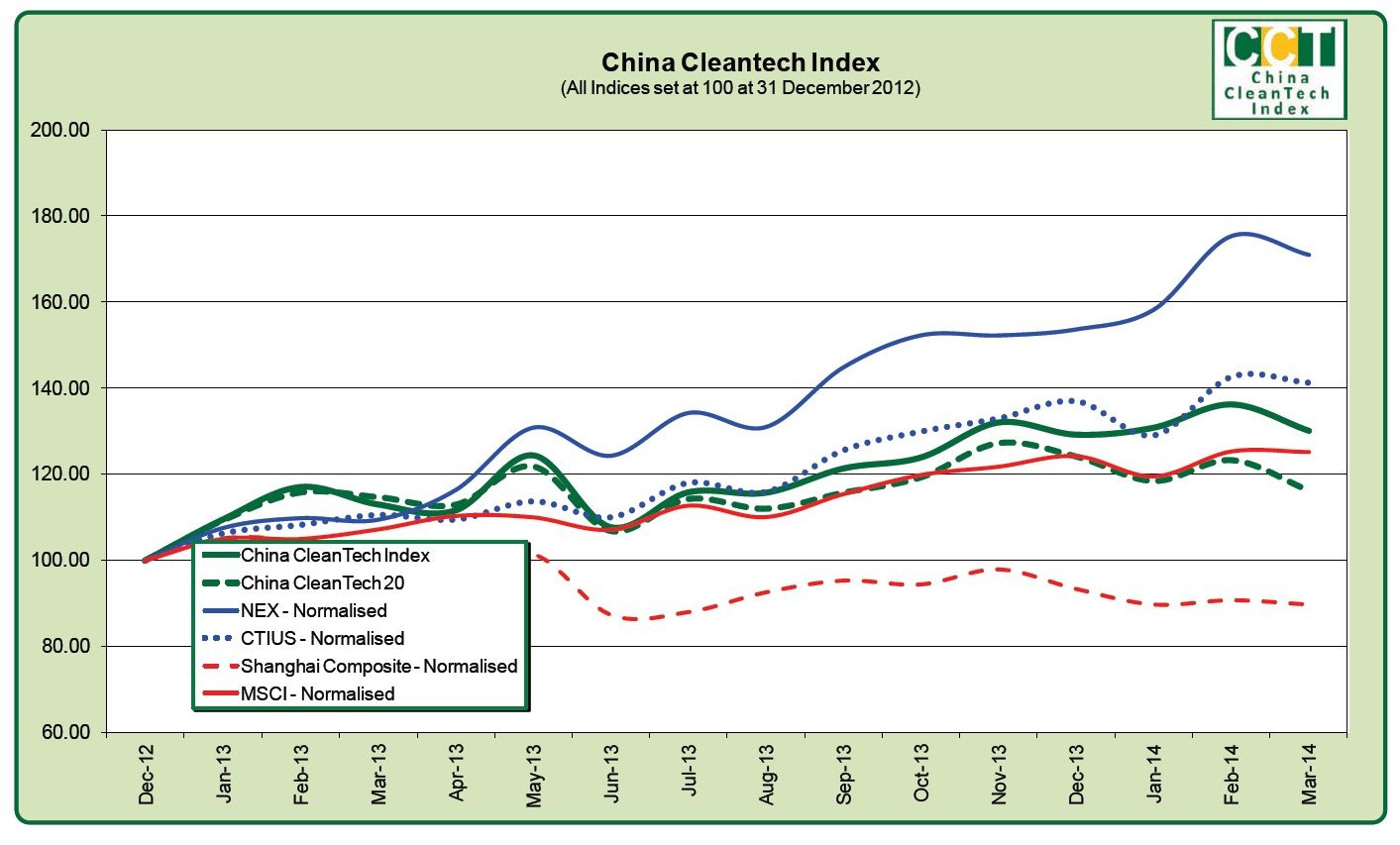 The China CleanTech Index underperformed all of its four benchmarks for the month of March 2014 and recorded a loss of 4.5%.
