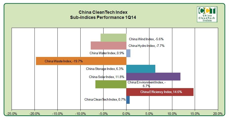 Over the first quarter of 2014, the China CleanTech Index recorded a gain of 0.7%, underperforming all but one of its benchmark indices. Over the quarter, the NEX gained 11.3%, the CTIUS gained 3.1%, the Shanghai Composite lost 3.9% and the MSCI gained 0.8%.