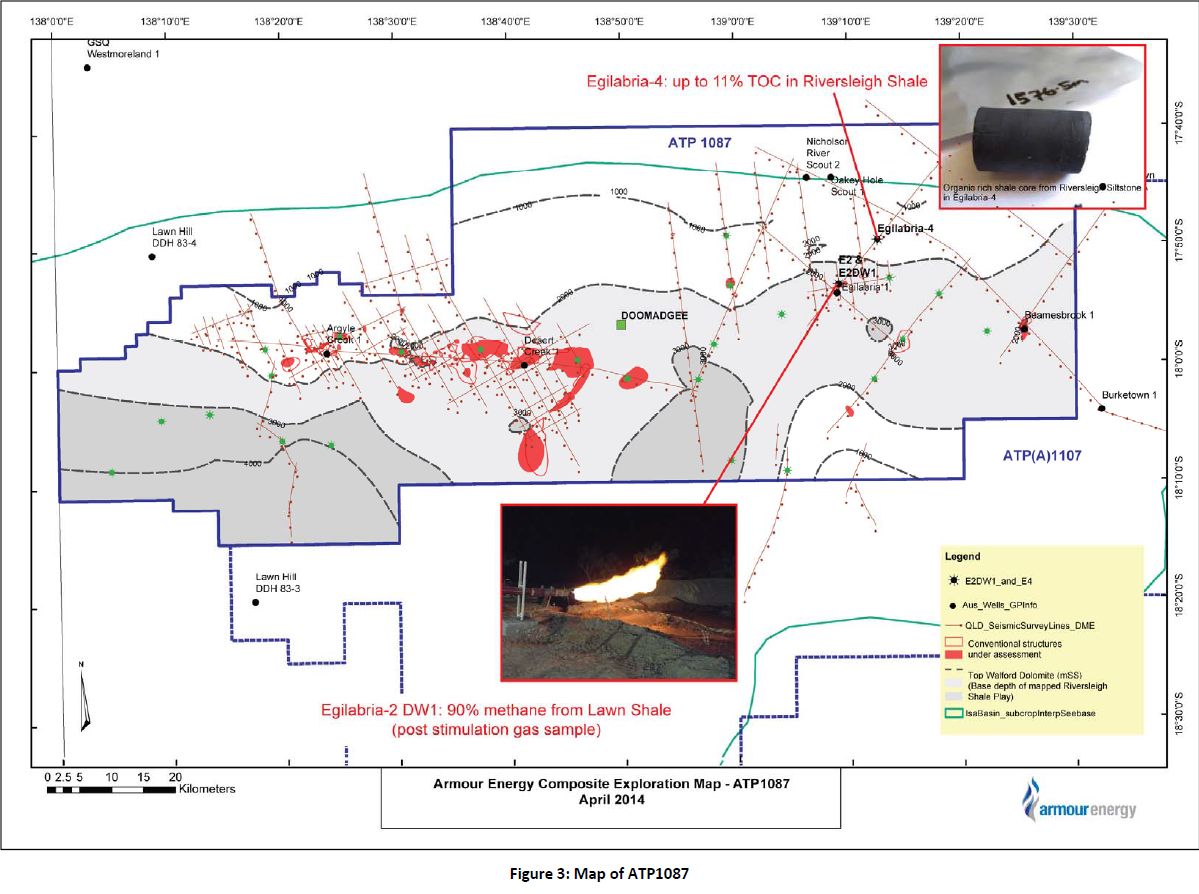 Armour drilled 2 wells in Queensland during 2013 in the eastern part of ATP1087 (See Figure 1 and 3 in link below). Egilabria-2 is the first lateral well in Australia to flow gas from a hydraulically stimulated shale formation. Subsequently, Egilabria-4 was drilled and discovered the gas charged Riversleigh Shale below the Lawn Shale. From both wells extensive technical data was collected which has been analysed over the past months.