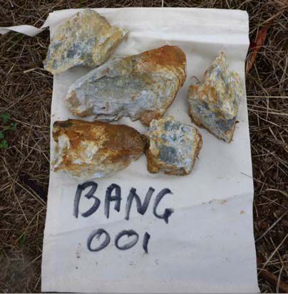 - One of four rock grab samples returned a gold assay of 77g/t Au (BANG001); taken from scree at surface, likely sourced from underlying geology
