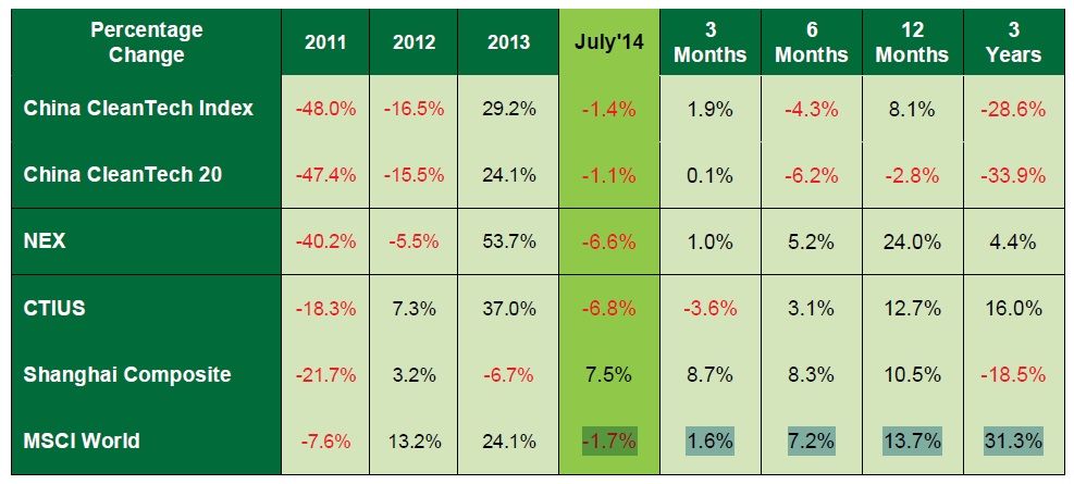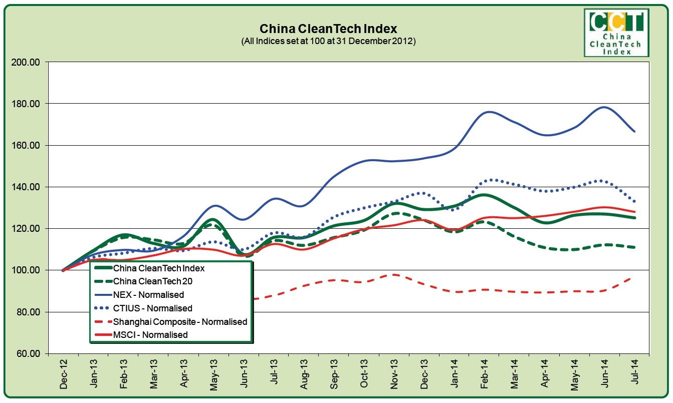 Melbourne, Aug 5, 2014 AEST (ABN Newswire) - The China CleanTech Index recorded a 1.4% loss in July 2014 but still outperformed all but one of its four benchmarks.