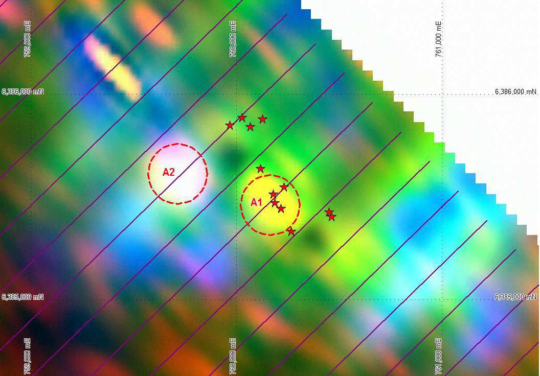 As well as confirming the A1 EM anomaly, the VTEM survey defined a stronger, deeper anomaly (A2 on Figure 3) around 400 metres west of Achaye. This new conductor has not been previously tested and represents a priority VMS target. The area will be followed up with soil and rock chip geochemistry as well as a ground EM geophysics survey to confirm the geometry and dip of the conductor prior to drilling. Ground EM survey configurations can detect extensions of EM anomalies at depth, not seen in the airborne VTEM system.
