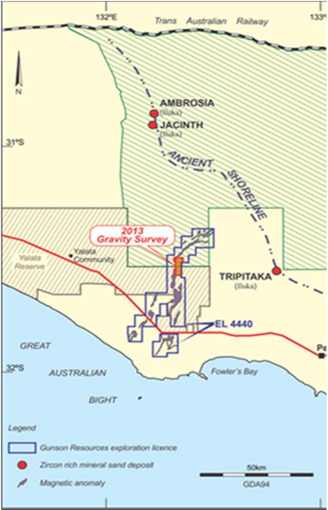 In late 2013, Strandline (formerly Gunson Resources Ltd) completed a gravity survey over a rectangular target area approximately 9km long by 3.5km wide. The results showed good correlation with a north-south trending magnetic zone defined by an earlier aeromagnetic survey. The gravity data suggests that the magnetic zone is comprised of mafic and possibly ultramafic rocks that may contain base metal sulphides.