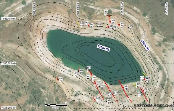 Structural mapping in the accessible southern part of the Belyando pit indicates that quartz-sulphide reefs strike north-west at a significant angle to the long section of the open pit. This observation has led to a re-interpretation of the pre-mining drilling results (Lawton, 1988; QDEX CR18140), which indicates potential for additional gold mineralisation to the south-east of the current pit. This conclusion is supported by elevated gold grades intersected by Zamia's hole RC14BY007 (ASX ZGM 24 February 2015) as well as pre-mining Induced Polarisation ('IP') geophysical data (Mustard, 1987; QDEX CR18248), showing the presence of a coincident resistivity and chargeability response that extends beyond the current pit (Figure 3).