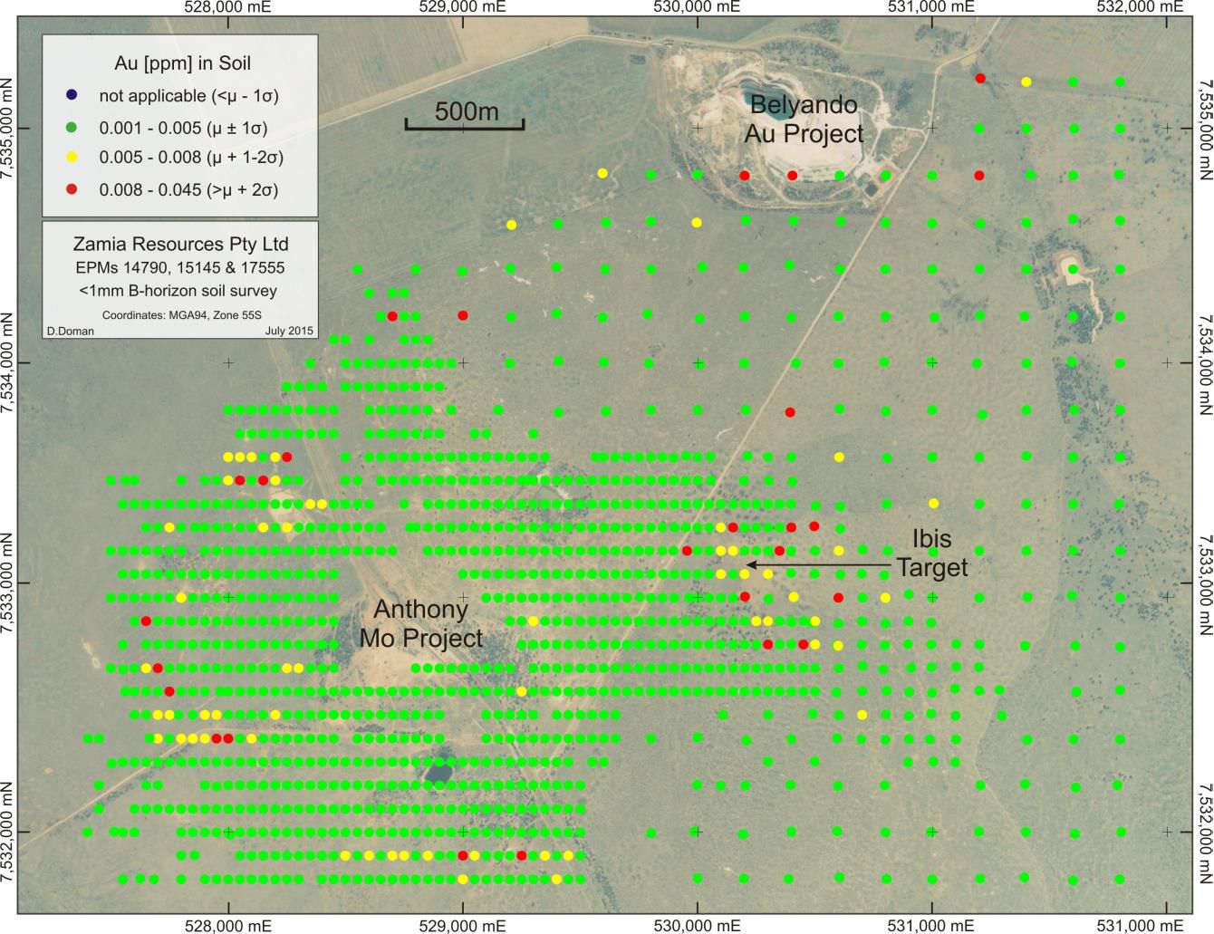 In April, Zamia extended the existing b-horizon soil geochemical grid surrounding to cover the area between the porphyry-style Anthony Mo deposit and the Belyando deposit with <1 mm sieved soil samples on 200m centres. Zamia collected 247 samples on EPMs 15145 and 17555, extending the sampling area to the south and in-filling the 'Ibis' target area with samples on 100m centres. All samples were pulverised to <75 µm and leached using aqua regia before assaying for gold and trace elements. Final assay results were returned in early July. Classified assay results for gold and arsenic are plotted in Figures 4 and 5 in link below.