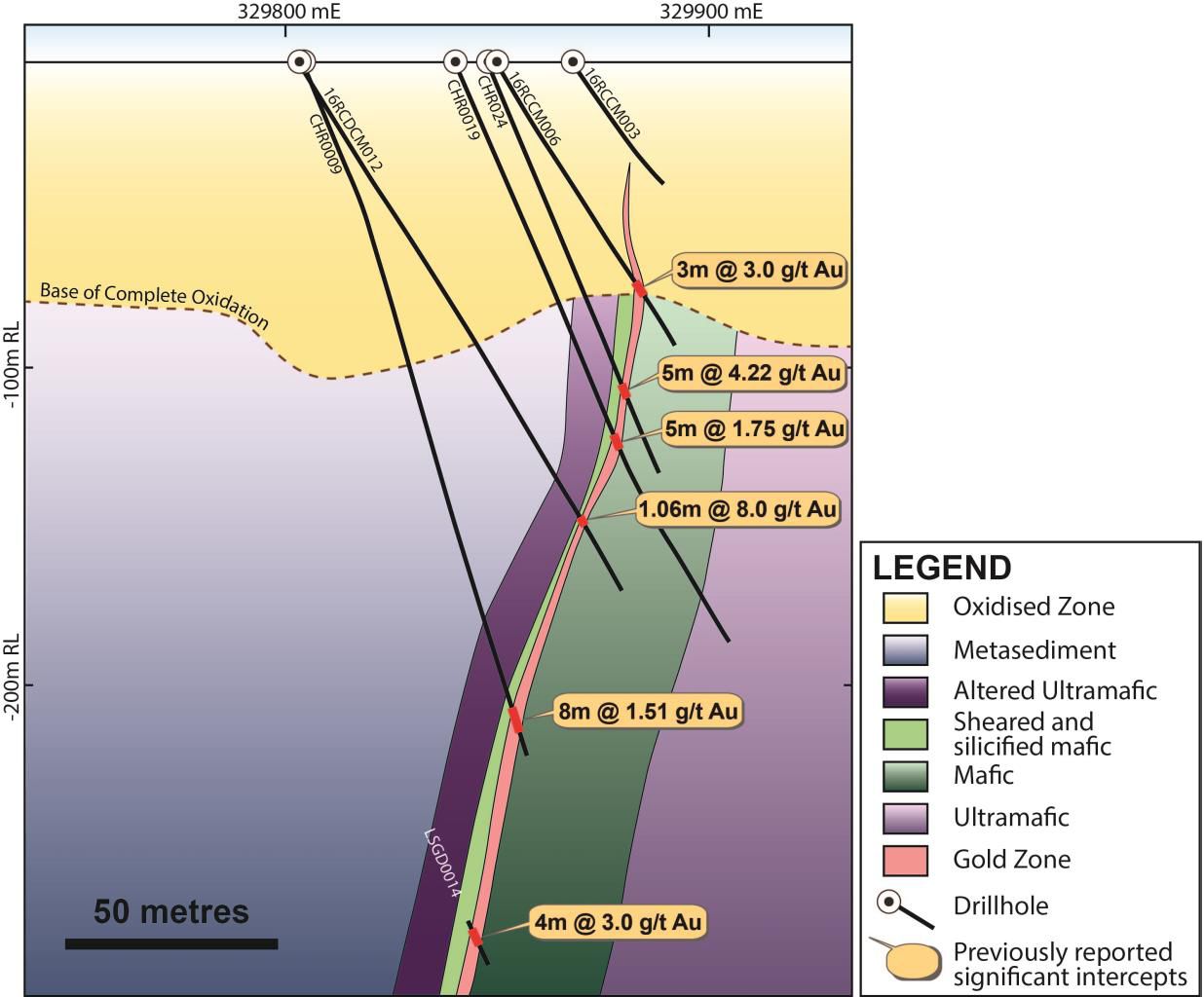 Minotaur announced a maiden gold resource for the deposit in July 2016. The Inferred Mineral Resource is derived from data along a 625m strike length and includes data as deep as 290m below surface (Figure 2, see link below). The deposit is strongly weathered up to 30m below surface, with the base of oxidation varying between 40-80m below surface. The strongly weathered zone is relatively depleted in gold. At the base of the depleted zone, gold appears supergene in nature and is interpreted to form flat lying blankets in some areas above and slightly west of the main gold zone.