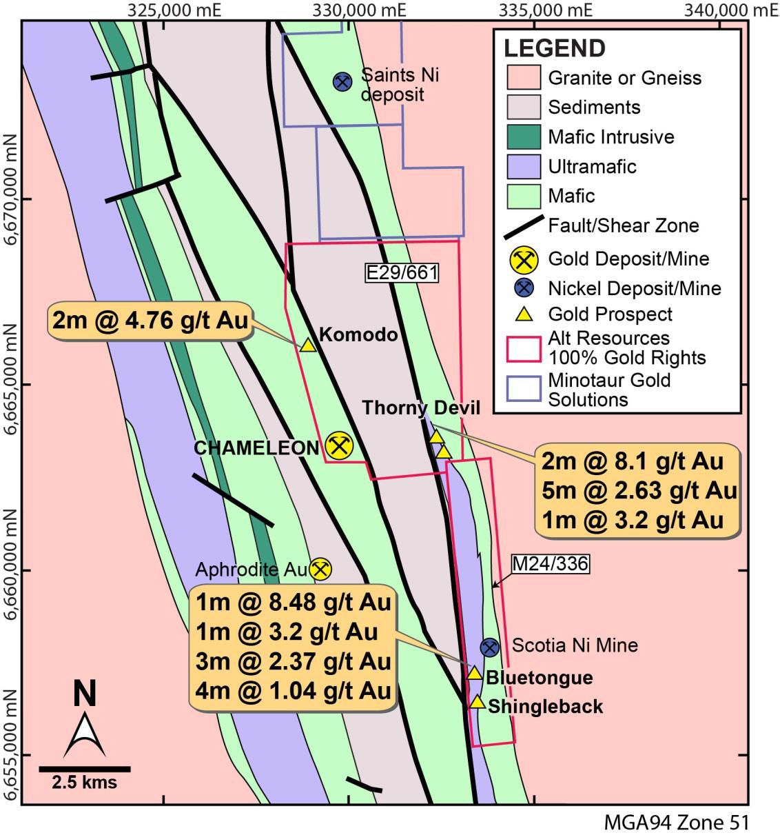 Alt Resources plans to investigate the gold potential of these outlying prospects. Exploration targets include shallow historical RAB and aircore intercepts at Komodo and Thorny Devil. The Company also aims to emulate Minotaur's success at Chameleon, by developing a better understanding of the lithological and structural controls on mineralisation at Bluetongue, and other prospects, to better target mineralisation along strike and at depth.
