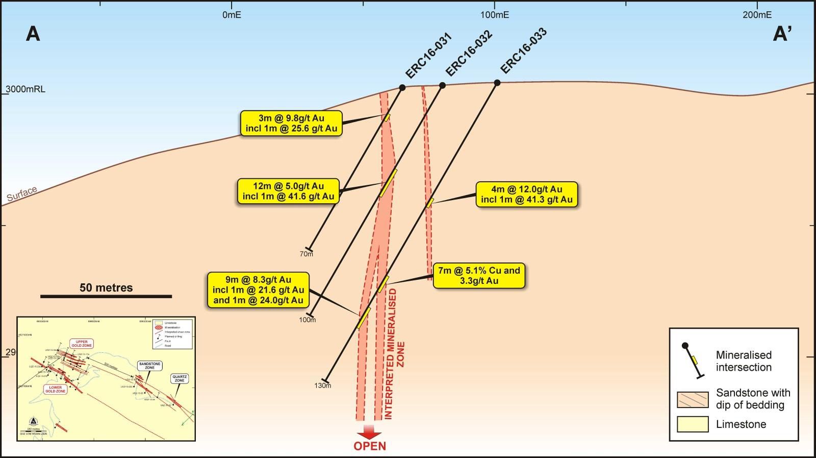 As of the date of this release a total of 3,615 metres have been completed in this year's drill program consisting of 16 diamond holes and 13 RC holes as detailed in Table 2 (see the link below). The Company is awaiting assay results for ERC16-28, 29 and 30, ERC16-34, 35, 36, 37, 38, 39 and 40.