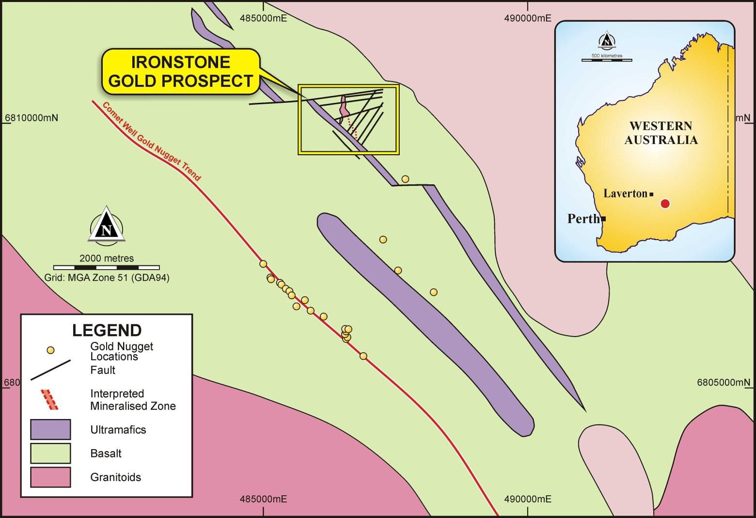 The Company reported the discovery of gold nuggets within the regional Ironstone Gold prospect in February 2016. Detailed metal detecting identified a significant number of gold nuggets at surface over a 3 kilometre long trend (the Comet Well trend) that coincides with a major regional fault structure. The nuggets were located by prospectors operating under a formal tribute agreement with the Company. Recent prospecting by the tribute group has identified visible gold from a 2 metre deep pit occurring adjacent to a quartz vein where 4 ounces of gold has been recovered (see Figure 8 in the link below). Along the 3 kilometre trend a total 40 ounces of gold has been recovered with the largest nugget weighing 20 grams.