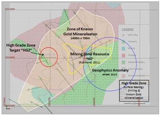 MA stated "It is likely that similar independent high grade gold deposits may be repeated at several places as splays off key structures over a potential area of at least 1400m by 700m." MA did caution that the potential quantity and grade was conceptual in nature. MA was commissioned by the Company to delineate a target for the HGZ area In its report, MA stated that the HGZ Target was defined by a 100m radius circle centred on the area of artisanal workings. (Figure 2 in link below)