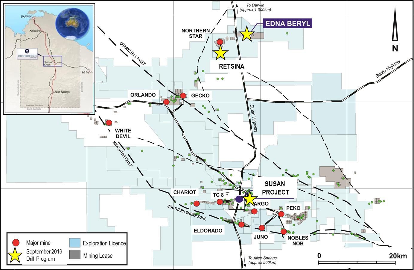 In addition, Emmerson is exploring the Tennant Creek Mineral Field (TCMF), one of Australia's highest-grade gold and copper fields producing over 5.5 Mozs of gold and 470,000 tonnes of copper from deposits including Warrego, White Devil, Orlando, Gecko, Chariot and Golden Forty. These high-grade deposits are highly valuable exploration targets, and to date discoveries include high-grade gold at Edna Beryl and Mauretania, plus copper-gold at Goanna and Monitor. These are the first discoveries in the TCMF for over a decade.