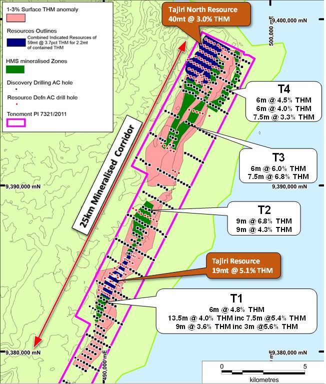 o Tajiri T4 is defined by a 3.2km long mineralised zone, 200 - 400m wide and 6 - 9m thick. Higher grade results include: 9m thick @ 6.7% THM, 6m @ 4.5% THM, 6m @ 4.0% THM and 7.5m @ 3.3% THM.