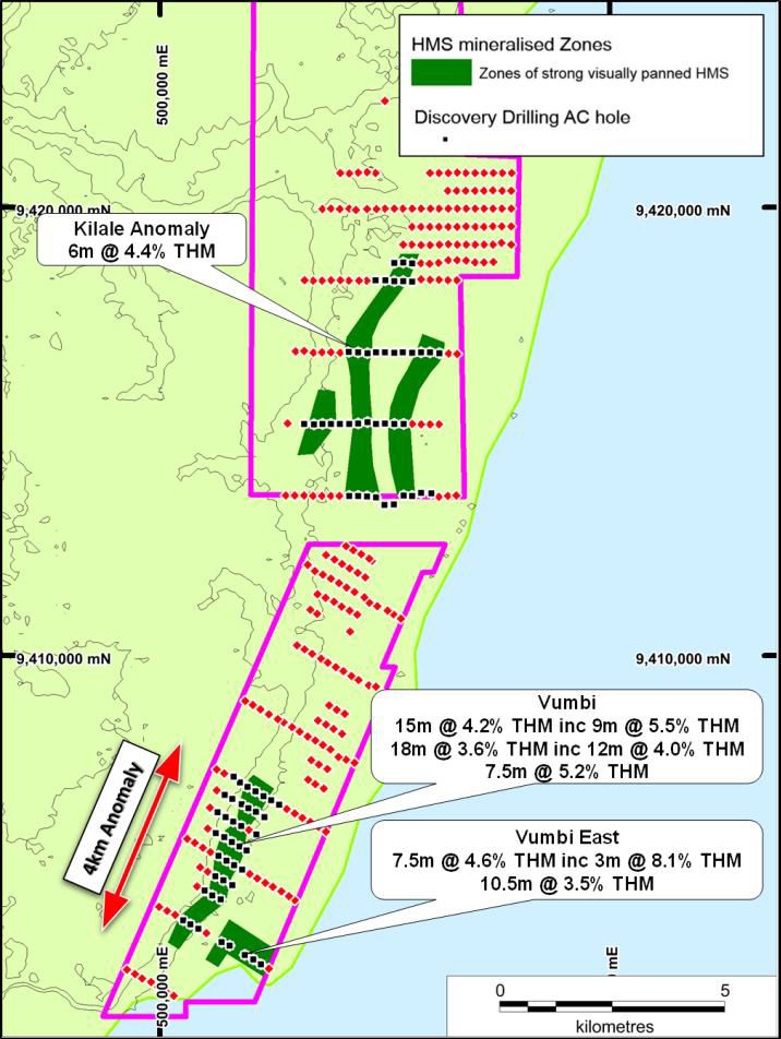 o Vumbi mineralisation is some 4.0km long, up to 400m wide with holes along strike ending the mineralisation at 15m deep. Higher grade drill results include: 15m @ 4.2% THM including 9m @ 5.5% THM, 18m @ 3.6% THM including 12m @ 4% THM and 7.5m @ 5.2% THM.