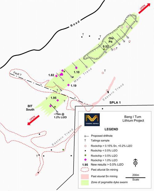 Results from rock chip sampling were received, confirming moderate to high grades of Li2O along the Main trend at Bang I Tum. As demonstrated in Figure 1 (see link below), the highest grade sample returned was 1.95% Li2O, which was located at Bang I Tum South, this occurs ~80m northeast of a previously reported float traverse which returned 75m @ 1.2% Li2O.