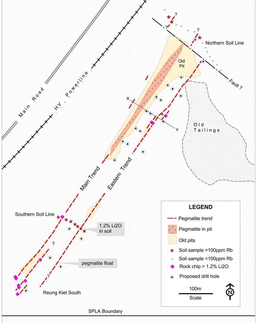 Soil sampling is currently focussed on extending the Main trend at Bang I Tum north and south of the historic tin mine. Pegmatites assaying anomalous Li and Sn have been reported along trend and up to 6km to the south west of the Bang I Tum historic tin mine.