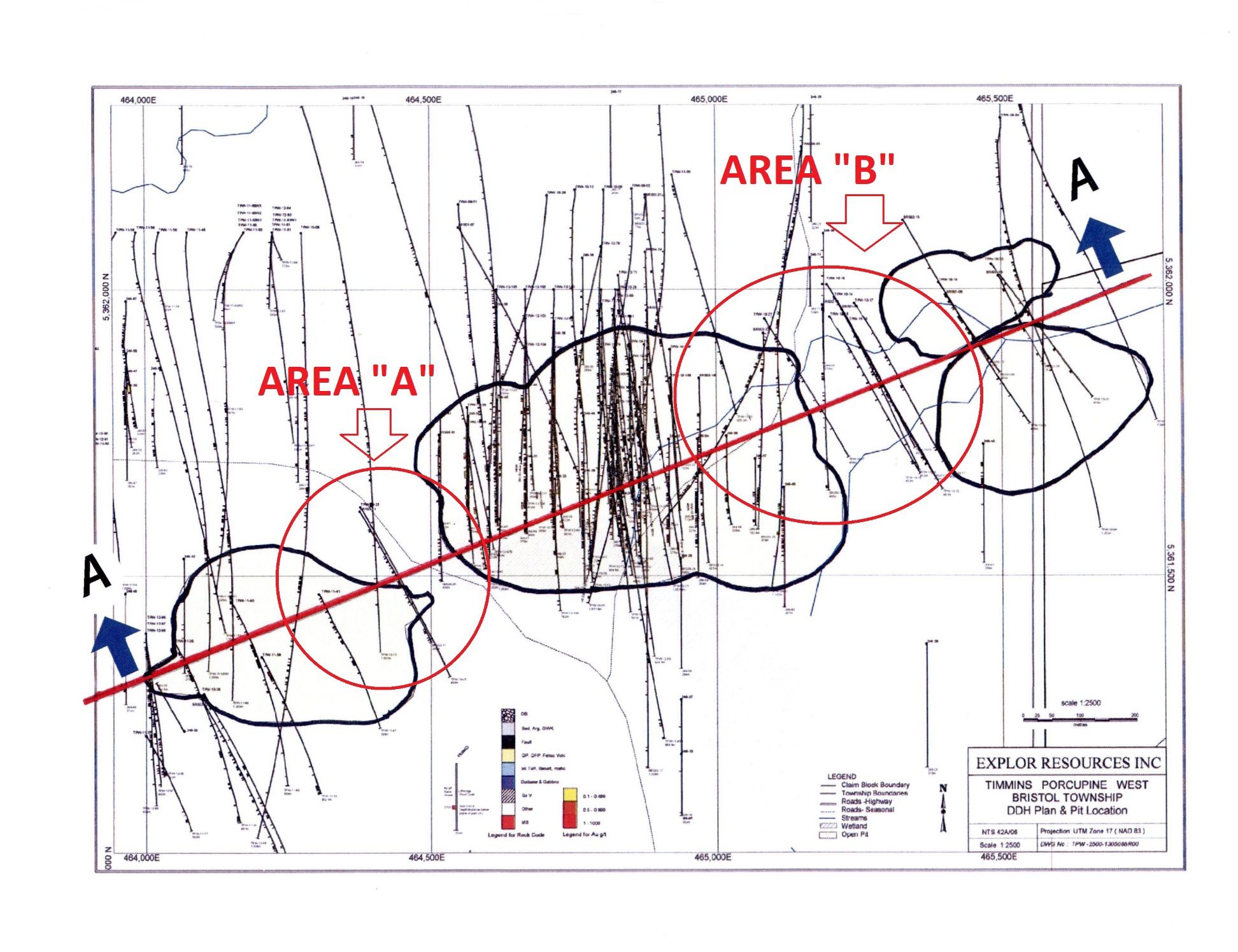 The attached DDH and Open Pit Plan view show the location of the three potential Open Pit areas that are located over an 1800 meter strike length and 250 meters of depth. The recently completed Diamond Drilling Program was concentrated in the eastern end in proximity to and in Area "B" in order to increase the near surface resource and connect the eastern portion of the potential open pit areas.