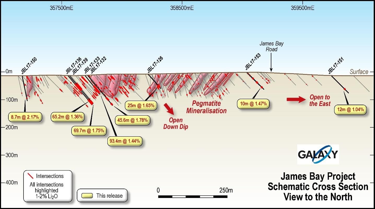 Managing Director and CEO, Anthony Tse commented "The results from this drilling campaign support the James Bay Project becoming a significant hard rock, high grade, long life lithium resource. This combined with its strategic location and proximity to local infrastructure means that the Project has very strong development fundamentals. Galaxy will now advance the studies necessary for the development of a mine and concentrate operations at James Bay, as well as the planned downstream lithium conversion facility to be located in Quebec Province. The experience we have gained with the restart of the highly successful hard rock operations at Mt Cattlin in Western Australia will be utilized extensively to assist with the development of the James Bay Project".