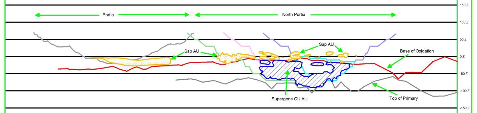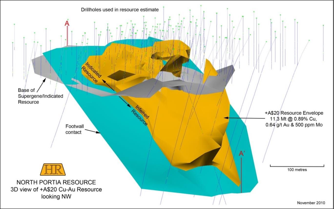 North Portia contains a JORC Indicated and Inferred Resource estimate of 11.3 million tonnes of 0.89% Cu, 0.64 g/t Au and 500 ppm Mo (refer to ASX announcement of 23 November 2010), based on Havilah's resource drilling that followed up on Pasminco's discovery drilling. The deposit consists of a primary chalcopyrite dominant sulphide zone below about 150 metres depth with encouraging earlier Pasminco diamond drilling results that include 74 metres (true width) of 1.06% copper and 1.2 g/t gold.